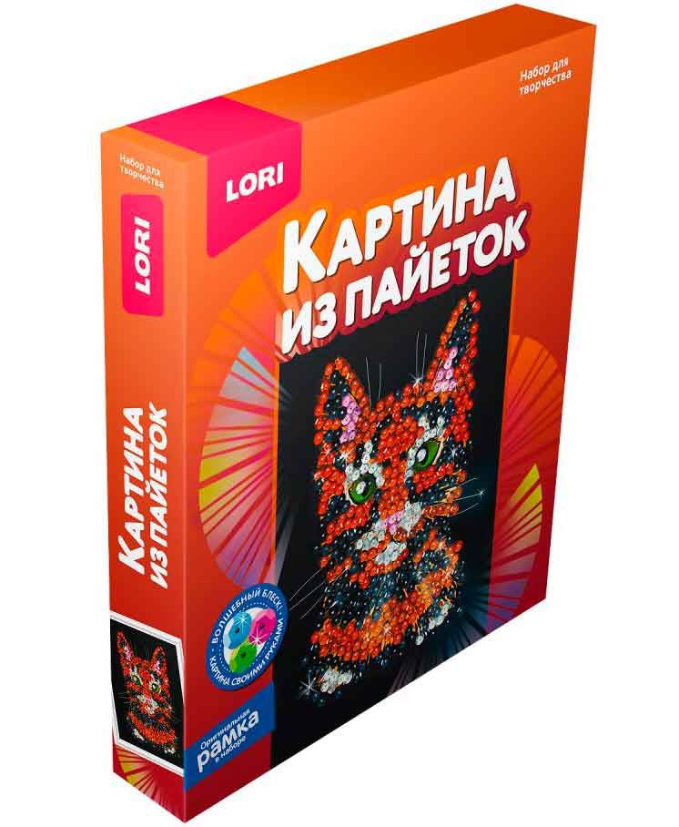 Комплектация: Разноцветные пайетки, основа рзмером 20 Х 25 см, рамка, цветная схема,пин-гвоздики, инструкция.