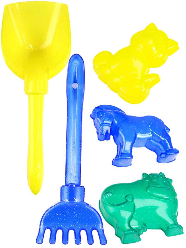 Набор песочный №49 прозрачный с блёстками (лопатка21см.+грабли21см.+3формживотные) И-3881