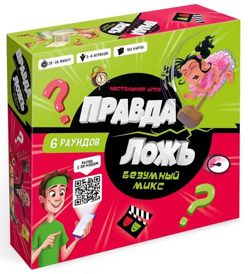 В наборе: 50 карточек "правда-ложь"; 40 карточек для поединка; 50 карточек для блица; 12 карточек (6 пар) для ответов игроков; 6 фишек; ламинированное игровое поле 46,5 х 46,5 см; правила.