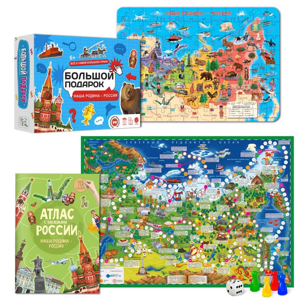В наборе: Карта-пазл с доп.реальностью. Животные России. 260 деталей. 47 х 33 см; Атлас мира с наклейками. Наша родина Россия. Формат 21 х 29,7. 65 см. наклеек. 16стр; Игра-ходилка "Путешествие по России" с фишками и кубиком 42 х 59,5 см.