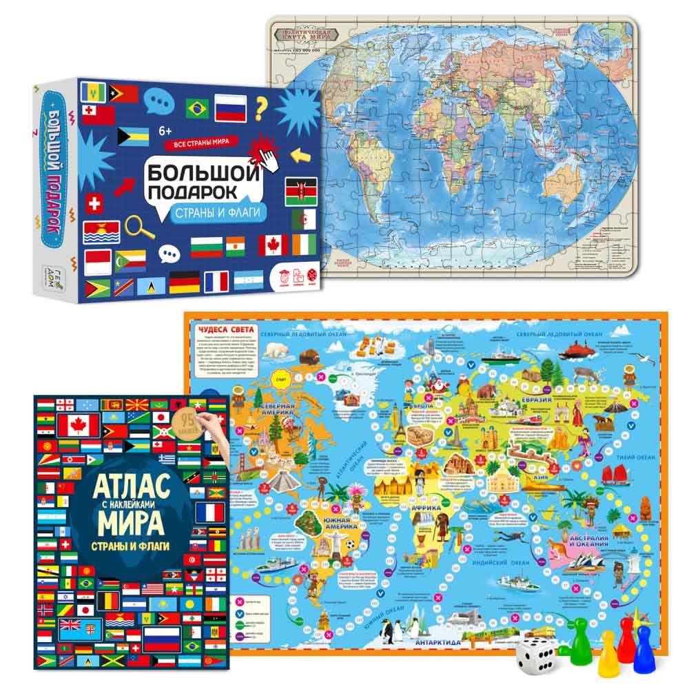 В наборе: Карта-пазл. Мир политический. Формат: 33 х 47 см. 260 деталей. Атлас с наклейками. Страны и флаги. Формат 21 х 29,7 см. 95 наклеек. Игра-ходилка "Чудеса света" с фишками и кубиком 58,5 х 40 см.