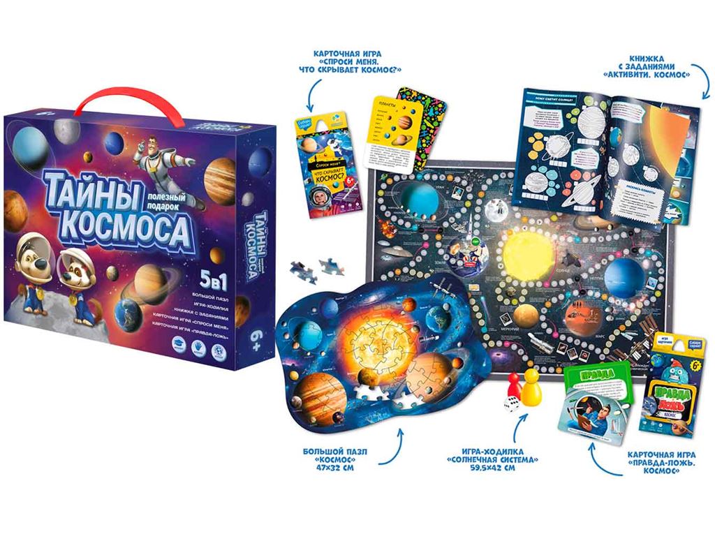 В наборе: Книжка с заданиями Активити Космос. Игра карточная Серия Правда-ложь Космос 60 карточек. Игра карточная Серия Спроси меня Что скрывает космос 54 карточки. Игра-ходилка с фишками Солнечная система 59,5х42 см; Пазл для подарков Космос 62 дета