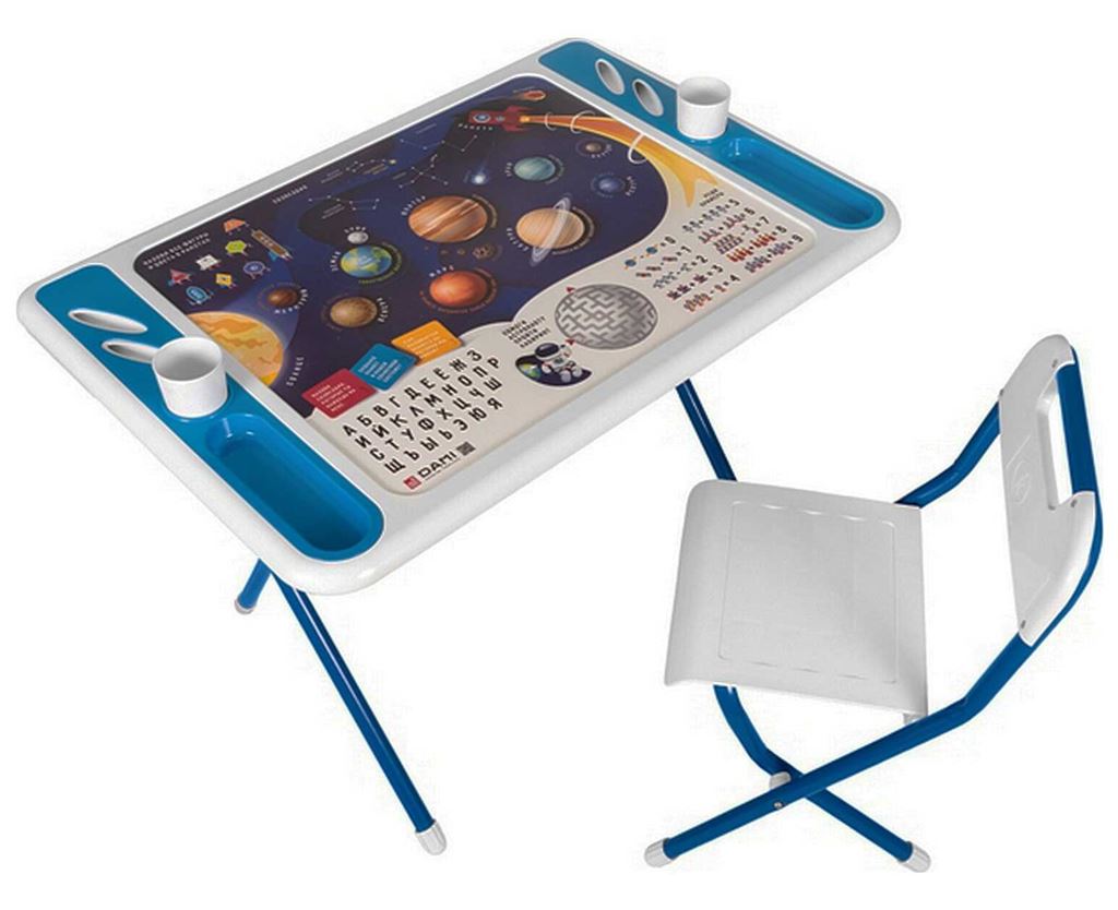 Стол с увеличенной столешницей и системой хранения детских приднадлежностей. Встроенные стаканчики под воду и кисти. Габариты: 55 Х 80 Х 58 см.