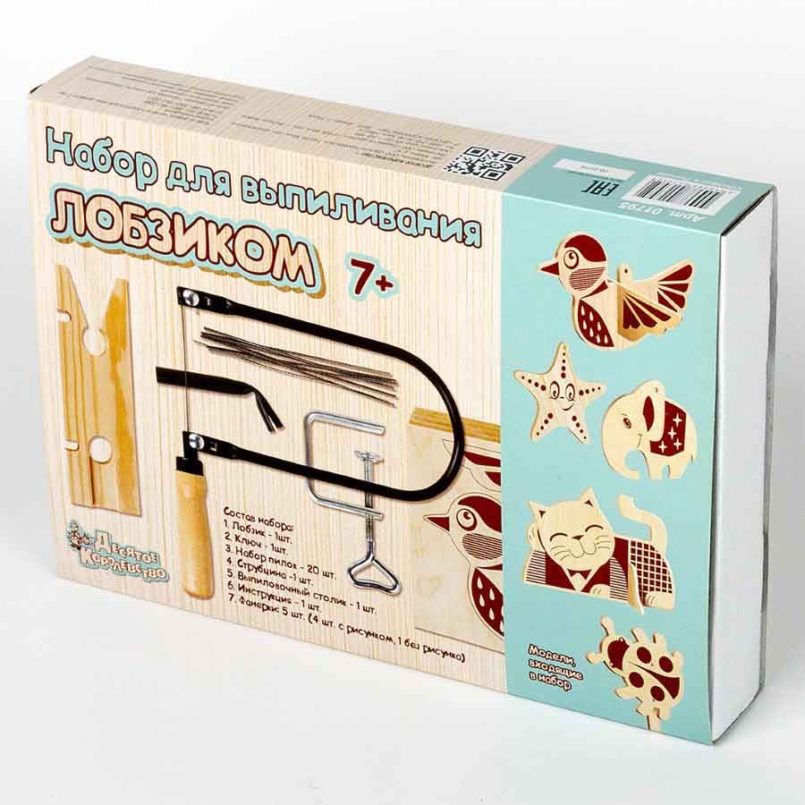 Размер упаковки: 28 x 19.5 x 4.5 см. Комплект: лобзик, ключ для барашковой гайки, 20 пилок, струбцина, выпиловочный столик, 4 фанерки без рисунка, 1 фанерка с рисунком.