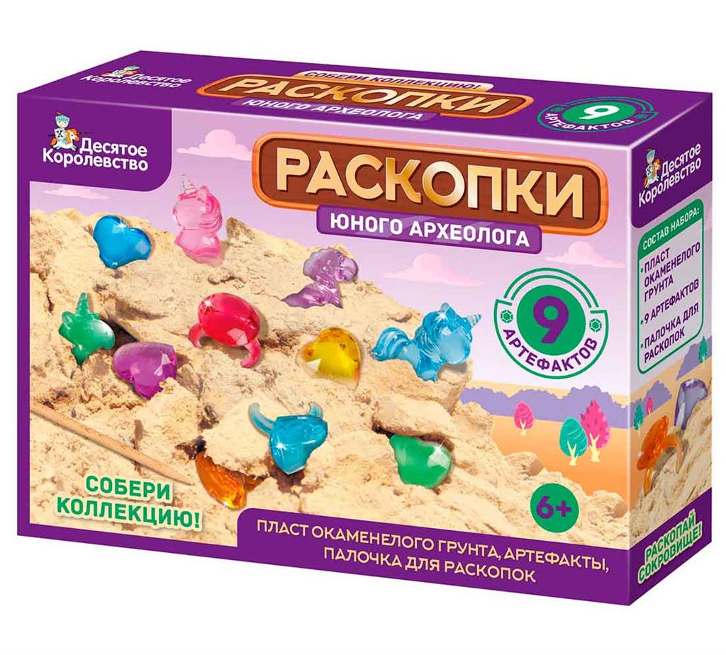 Размер упаковки: 17,3 Х 12,4 Х 4,4 см. В наборе: Пласт грунта (гипс) - 11х4х16 см; Деревянный стек; Разноцветные фигурки из пластика 9 шт.