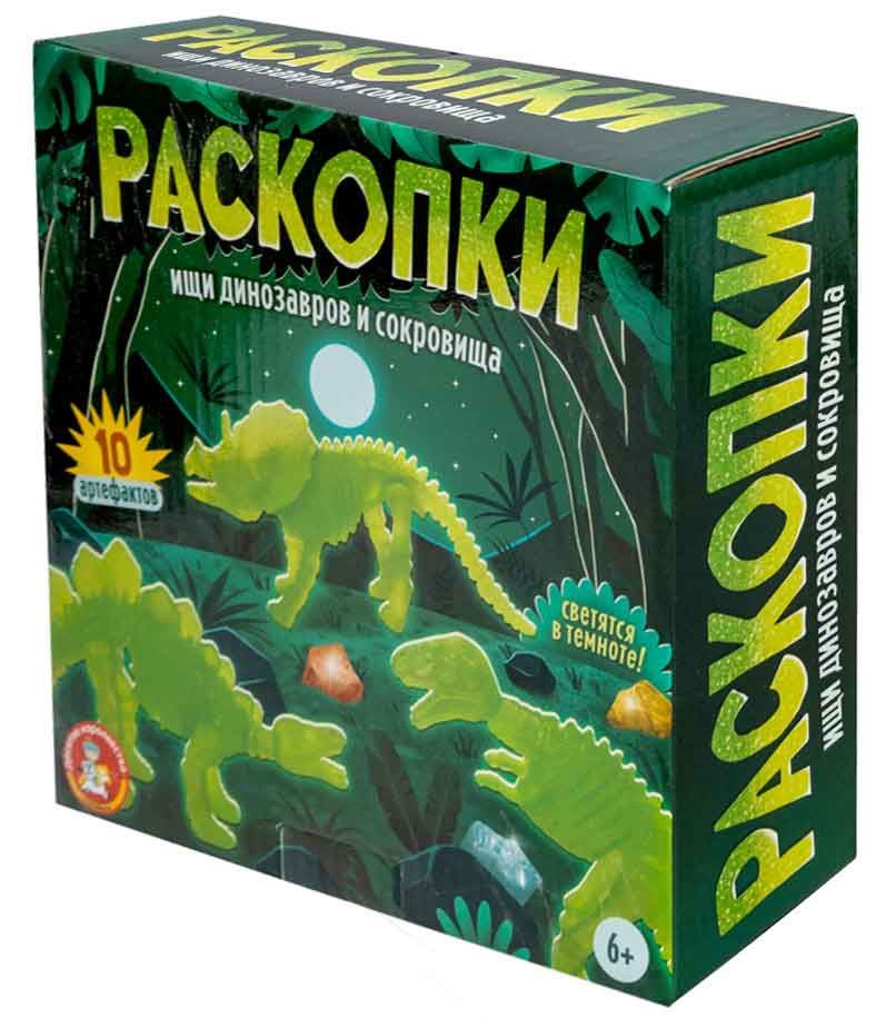 Размер упаковки: 17,5 Х 17,8 Х 6,2 см. В наборе: пласт грунта (гипс, 11,5х11,5х4 см); инструменты из пластика (щетка, стек, молоток, длина 10 см) 3 шт; скелеты динозавров 3 шт. кристаллы 7 шт.