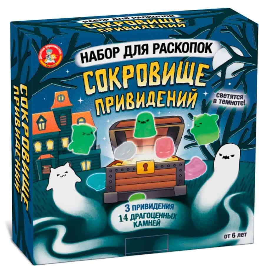 Размер упаковки: 17,5 Х 17,8 Х 6,2 см. В наборе: пласт грунта (гипс, 11,5х11,5х4 см); инструменты из пластика (щетка, стек, молоток, длина 10 см) 3 шт; фигурки привидений 3 шт. (светятся в темноте); драгоценные камни 14 шт. (светятся в темноте)