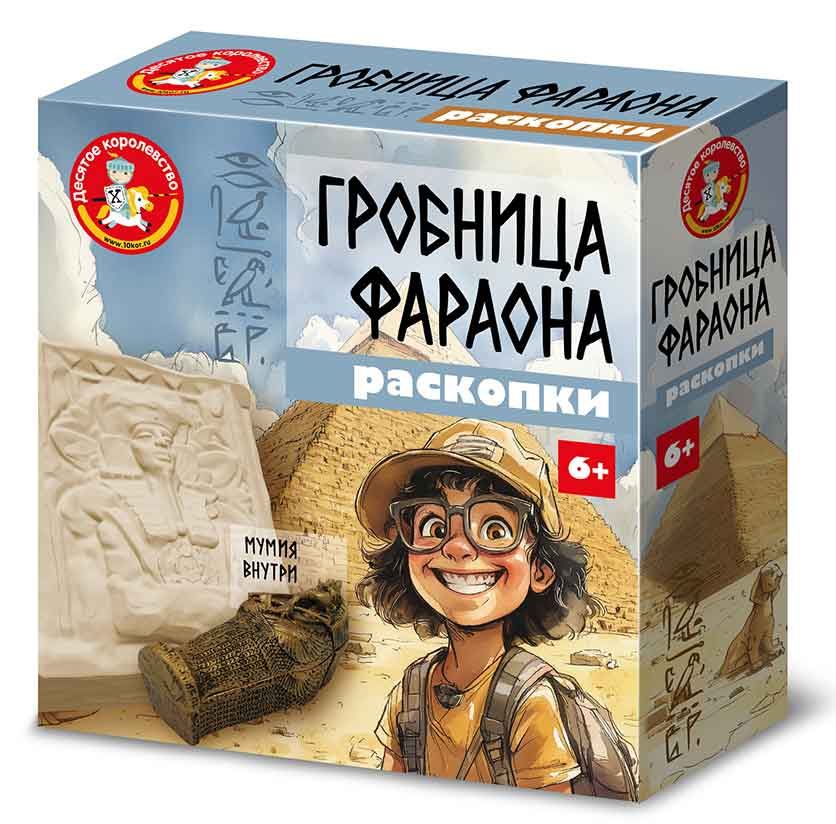 Размер упаковки: 17,5 Х 17,8 Х 6,2 см. В наборе: пласт грунта (гипс, 11,5х11,5х4 см); инструменты из пластика (щетка, стек, молоток, длина 10 см) 3 шт; саркофаг, мумия, кристаллы 5 шт.