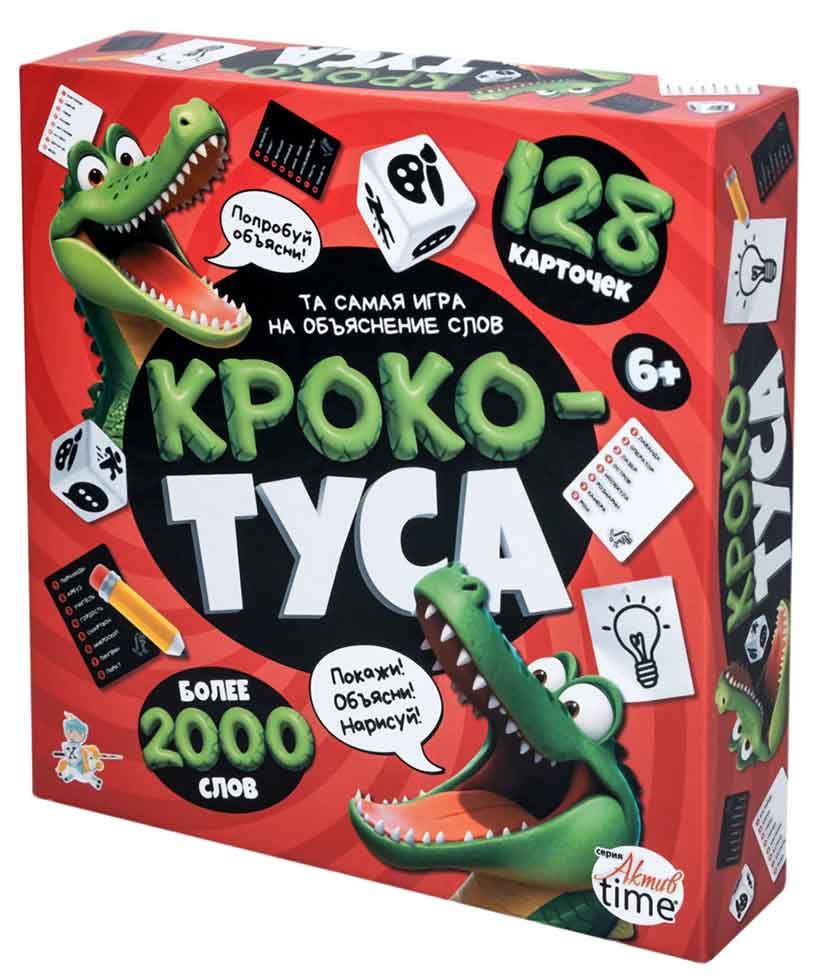Размер упаковки: 20,8 Х 20,8 Х 4,8 см. В наборе: игровое поле (38х19 см); карточки 128 шт. (двухсторонние) (7,5х5,5 см); кубик (2х2 см); фишки разных цветов (высота 2 см) 6 шт; песочные часы (высота 6 см); правила игры.