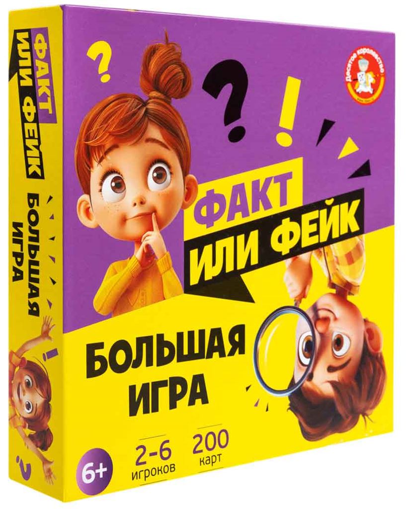 Размер упаковки: 20,8 Х 20,8 Х 4,8 см. В наборе: игровое поле из ламинированного картона 38х38 см. игровые фишки 6 шт. карты "факт-фейк" (8,6х5,7 см) 64 шт. карты "быстрее молнии" (8,6х5,7 см) 50 шт. карты "было-не было" (8,6х5,7 см) 34 шт. карты "бл
