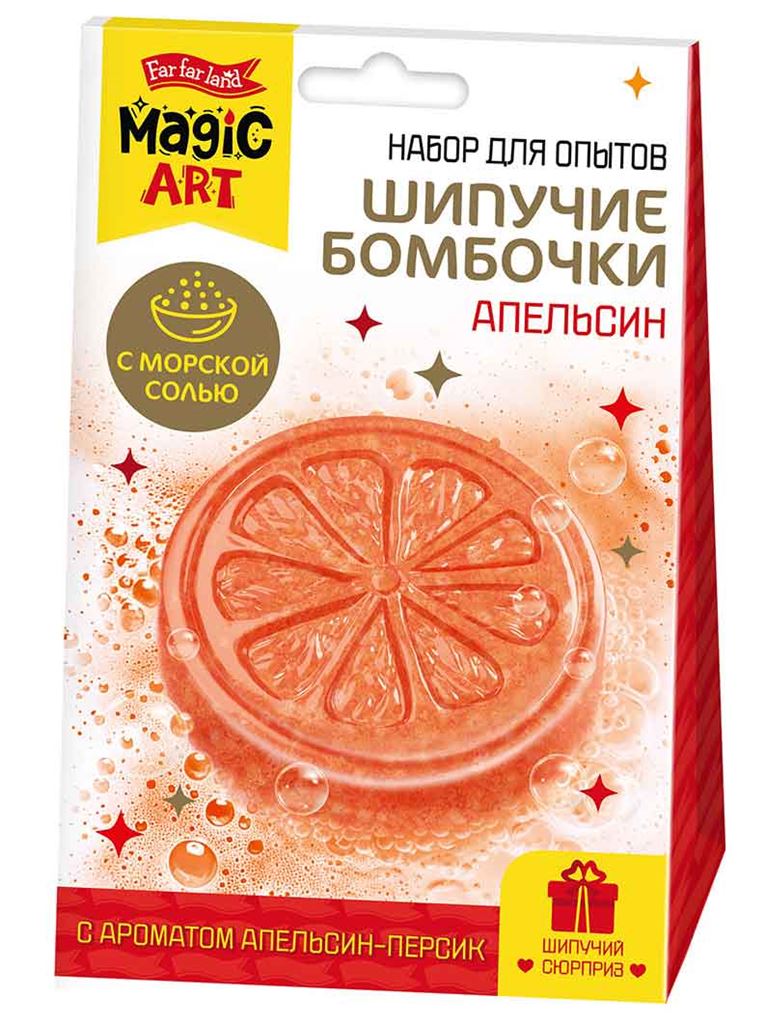 Размер упаковки: 19,2 Х 12 Х 4,2 см. В наборе: морская соль; сода пищевая; лимонная кислота; краситель пищевой с отдушкой Персик; перчатки одноразовые; пластиковая форма; инструкция.