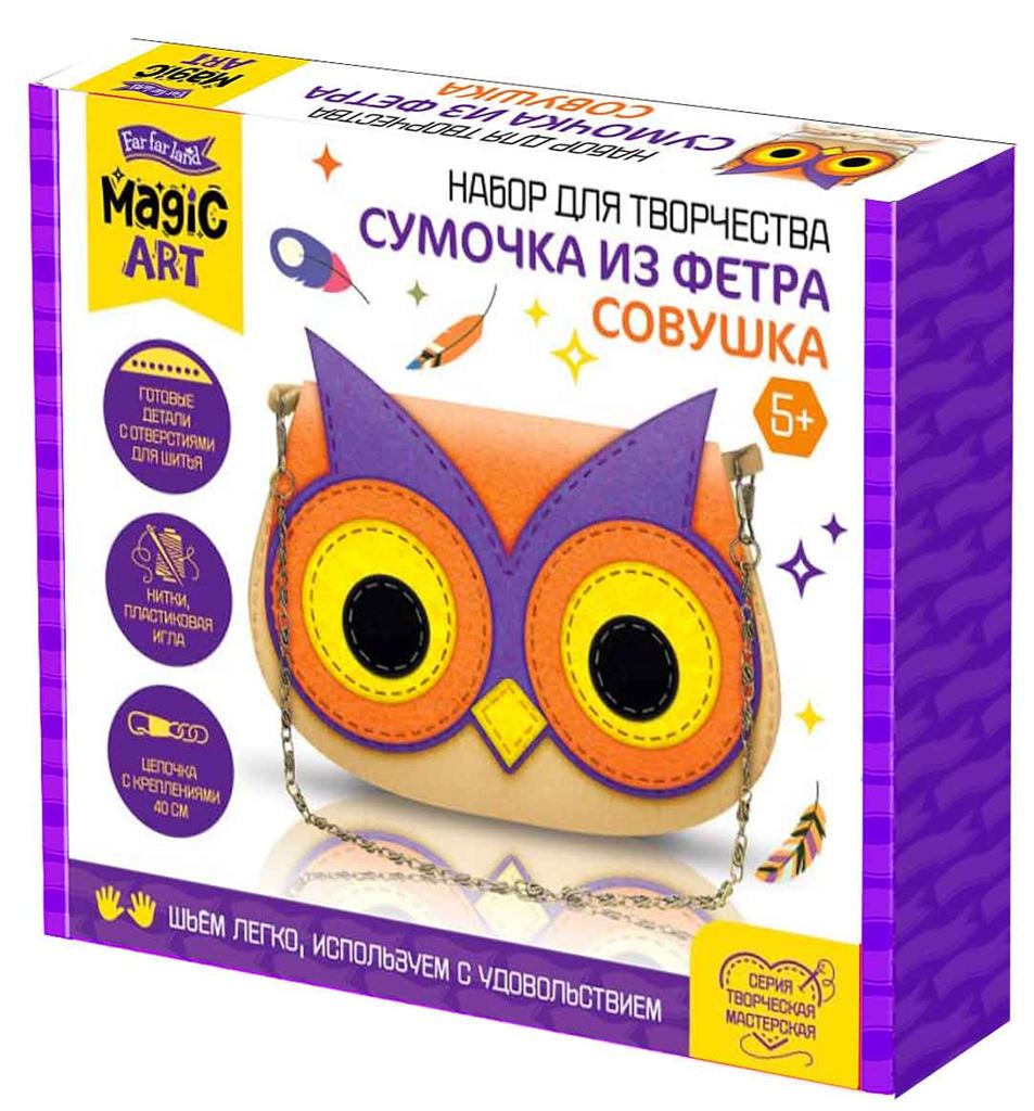 Размер упаковки: 23,5 Х 20,5 Х 3,8 см. В наборе: пластиковая игла (5 см); нитки черные и коричневые; заготовки из фетра с отверстиями для шитья; липучка "велькро"; цепочка с креплениями (длина 40 см)