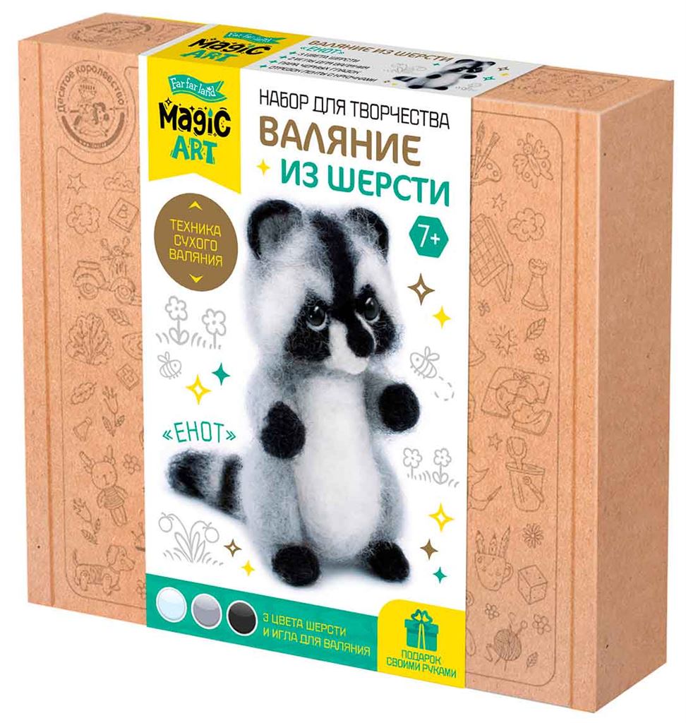 Размер упаковки: 23,5 Х 20,5 Х 3,8 см. В наборе: шерсть для валяния 3 цвета; игла для валяния металлическая 2 шт; глазки из пластика; крепление для брелока; инструкция.