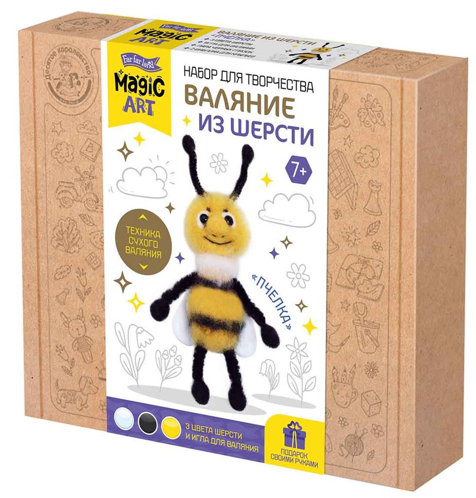 Размер упаковки: 23,5 Х 20,5 Х 3,8 см. В наборе: шерсть для валяния 3 цвета; игла для валяния металлическая 2 шт; глазки из пластика 2 шт; крылья из фетра; основа для брелока; пушистая палочка; лента-липучка; инструкция.